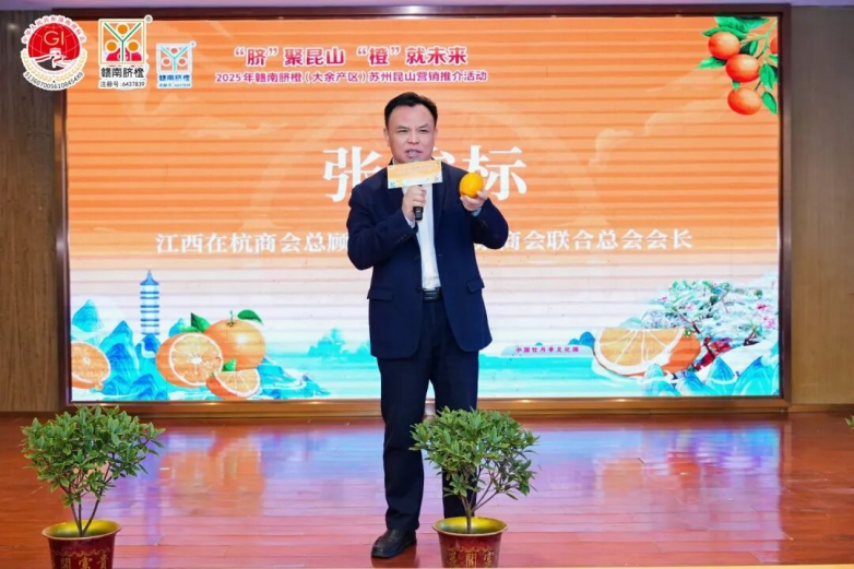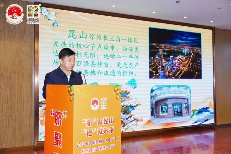 苏州市政府机关殷明在致辞中对本次推介活动的举办给予高度肯定,他表示,昆山作为长三角一体化发展核心节点城市与全国百强县榜首,既是农产品消费高地,也是流通枢纽,大余赣南脐橙的优质品质与昆山的市场优势高度契合,期待两地以本次活动为契机,深化产业联动,实现资源共享。