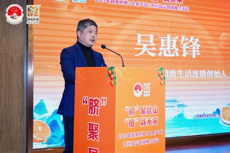江苏石头剪刀布商业经营管理有限公司创始人吴惠锋作为渠道代表致辞,他提及企业以“中产家庭生活方式服务商”定位,深耕江苏十余年,有二十多家社区连锁店及近五万高端会员,正拓展水果生鲜领域;他认可大余赣南脐橙品质与品牌,期待长期合作,通过“实体+私域”模式将其带给长三角消费者。