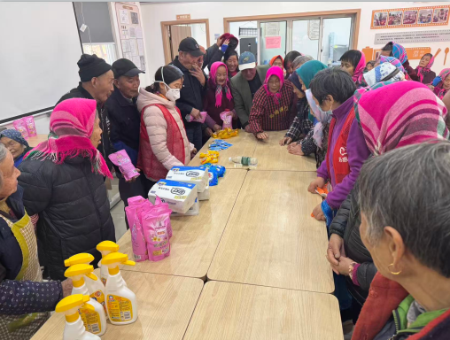 活动还未开始,现场就已经热闹起来。老人们有的互相交流着套圈的小技巧,有的饶有兴致地打量着琳琅满目的礼品——包装精美的牙膏牙刷、去污力强的洗衣液、柔软亲肤的餐巾等等,全都是日常生活的刚需品,让人目不暇接。大家脸上都洋溢着期待的笑容,三五成群地唠着家常,冬日的寒意也被这热闹的氛围驱散殆尽。
