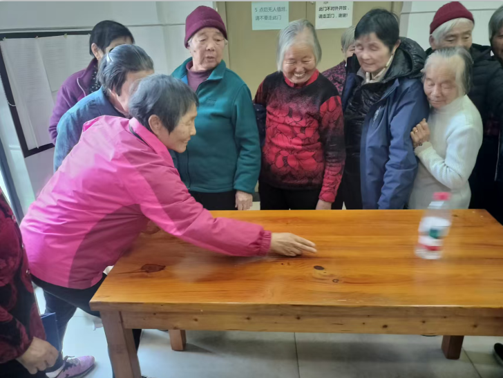 推瓶子游戏规则简单易懂:参与者需站在指定位置,用手掌平稳推动瓶子,使瓶子停在长桌上,距离终端最近又没有掉下桌子者获胜。看似简单的游戏,却十分考验老人的手眼配合能力和力度控制。有的老人屏住呼吸,小心翼翼地推动瓶子,生怕用力过猛;有的老人则从容不迫,凭借多年的生活经验精准掌控力度,瓶子稳稳停在桌子末端,引得周围阵阵喝彩。日照工作人员为参加活动的老人发了实用的生活用品。拿到奖品的赵奶奶喜笑颜开:“奖品不重要,重要的是在这儿认识了新朋友,玩得特别尽兴,希望以后多组织这样的活动。”