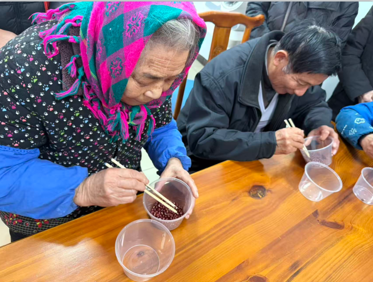 活动当天,日间照料中心热闹非凡。老人们围坐在桌子旁,眼神中透露出期待与兴奋。工作人员早早地准备好了透明塑料杯和一双双筷子,还有那圆润饱满的红豆,作为游戏的重要道具。当工作人员宣布游戏规则后,老人们纷纷摩拳擦掌,跃跃欲试。