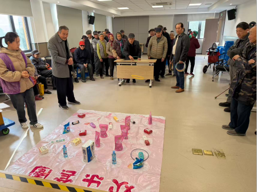 冬日的阳光透过玻璃窗,洒在淞潭日间照料中心的活动室里,映得老人们的脸庞格外温暖。2025年12月4日下午,一场别开生面的滚瓶子趣味活动在这里热闹举行,肥皂、蛇油膏、卫生纸等一件件实用礼品整齐陈列,伴随着老人们的欢声笑语,构成了一幅温馨动人的画面。