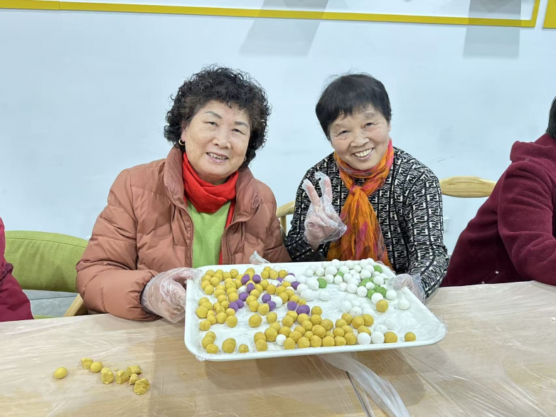 在巧手包汤圆环节,工作人员提前精心准备好糯米粉、南瓜、紫薯、菠菜汁、托盘、一次性手套等物料,耐心细致地为老人们示范揉面、包馅、搓圆的技巧,手把手讲解制作小窍门,格外贴心地照料行动不便的老人。老人们围坐在一起,兴致勃勃、认真专注地动手操作,揉面、塑形、搓圆,动作娴熟又从容。大家一边制作,一边闲谈家常、交流心得,欢声笑语不断,现场气氛温馨又热闹。