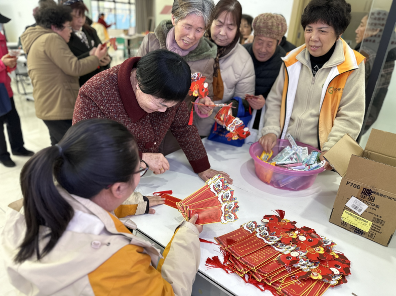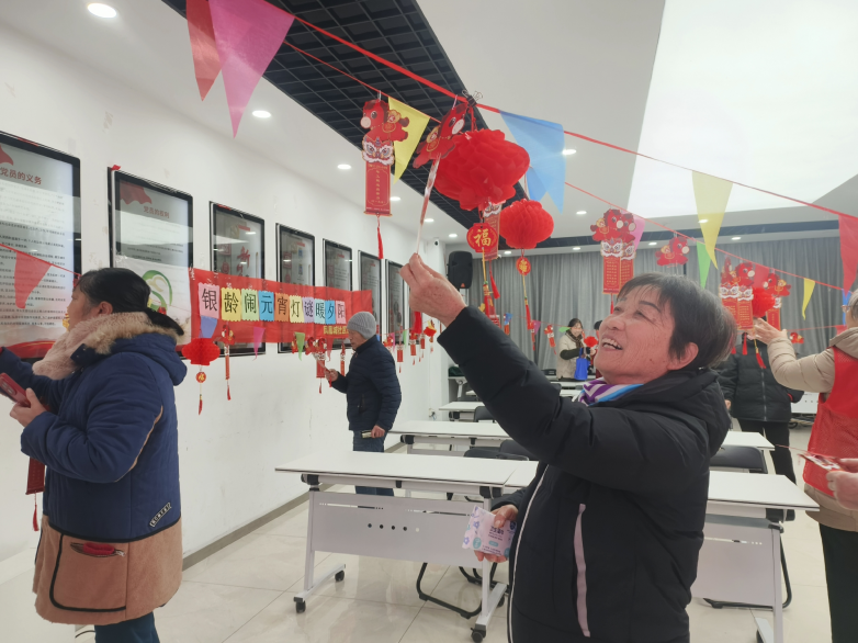 吃完甜甜的小圆子,趣味盎然的猜灯谜环节将活动推向了高潮。工作人员精心准备了百余条灯谜,内容涵盖传统文化、健康养生、时事政策、生活常识等多个方面,既有趣味性又有知识性。一条条红彤彤的谜面悬挂在活动现场,映照着老人们专注思考的脸庞。有的独自凝神思索,有的三五成群热烈讨论,“这个我知道!是‘福如东海’!”“哎呀,这个谜底是‘寿比南山’,我差点就想出来了!”每当有人猜出谜底,便能赢得一份小小的纪念品,喜悦之情溢于言表。猜谜过程中,老人们开动脑筋,互相启发,在感受中华文字魅力的同时,也锻炼了思维能力,增添了无穷乐趣。“这活动真好,脑子转一转,心里乐一乐,感觉人都年轻了!”葛爷爷拿着刚兑换的小奖品,高兴地说道。